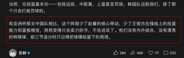 苏群:中国男篮输给韩国很不应该,没有王俊杰突然不会进攻了